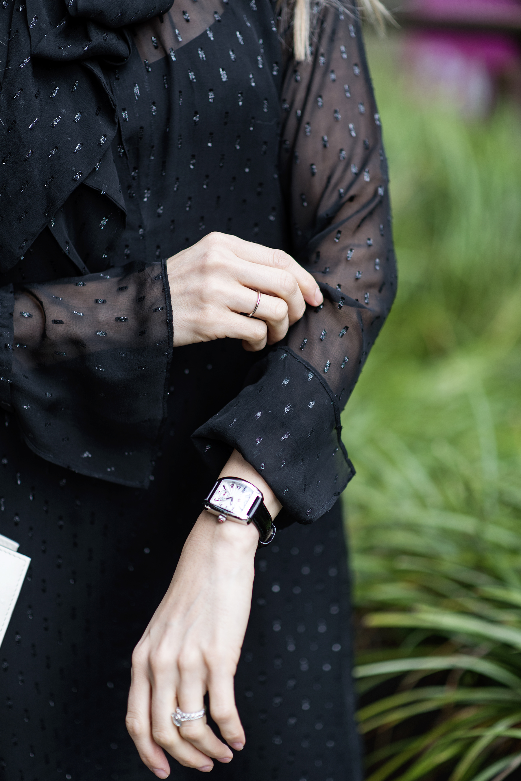 The ability to add a variety of black pieces, each with different texture, details and fabrics… the way it makes you look so perfectly posh… the way a bright white bag and a red lip can make the entire look pop.