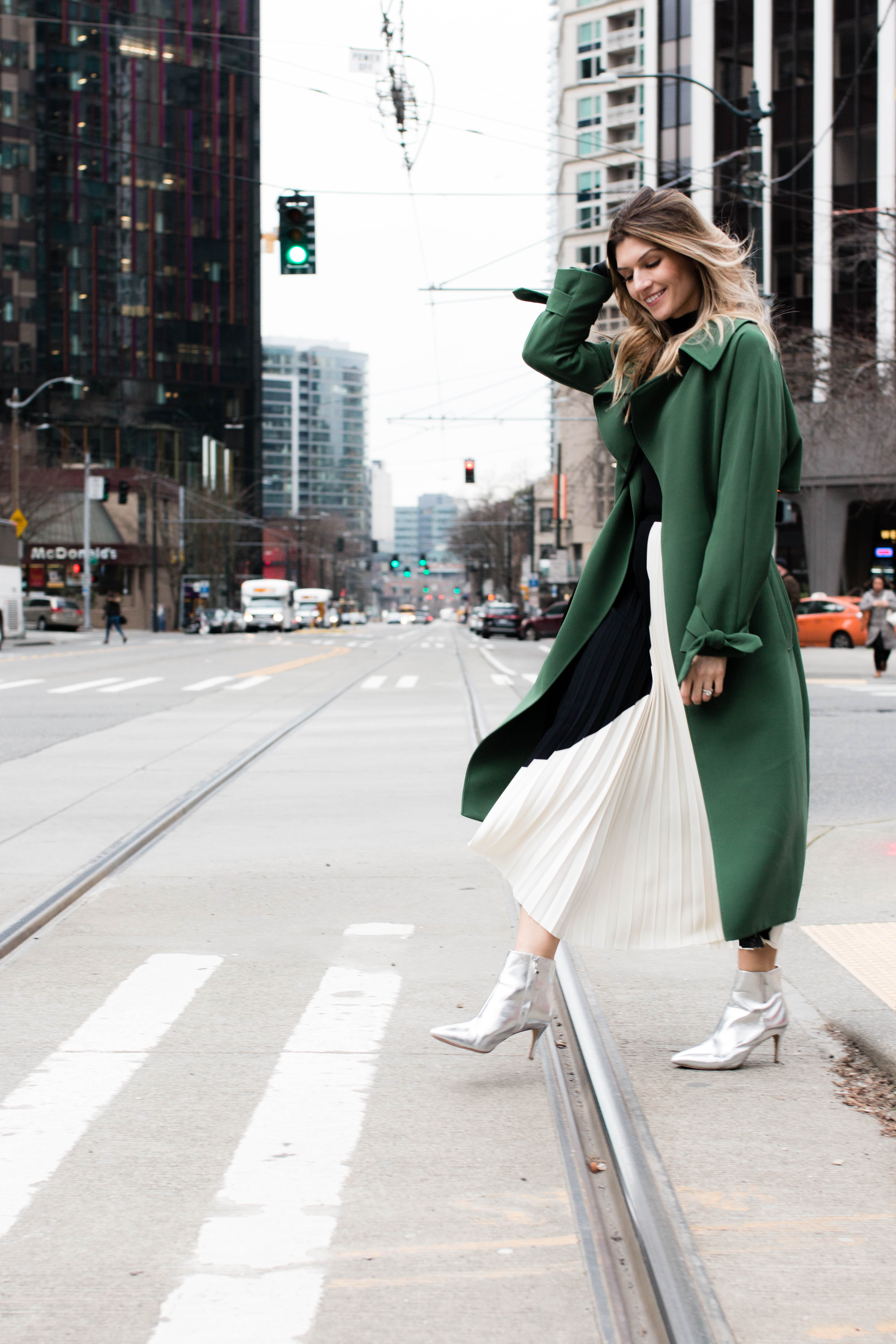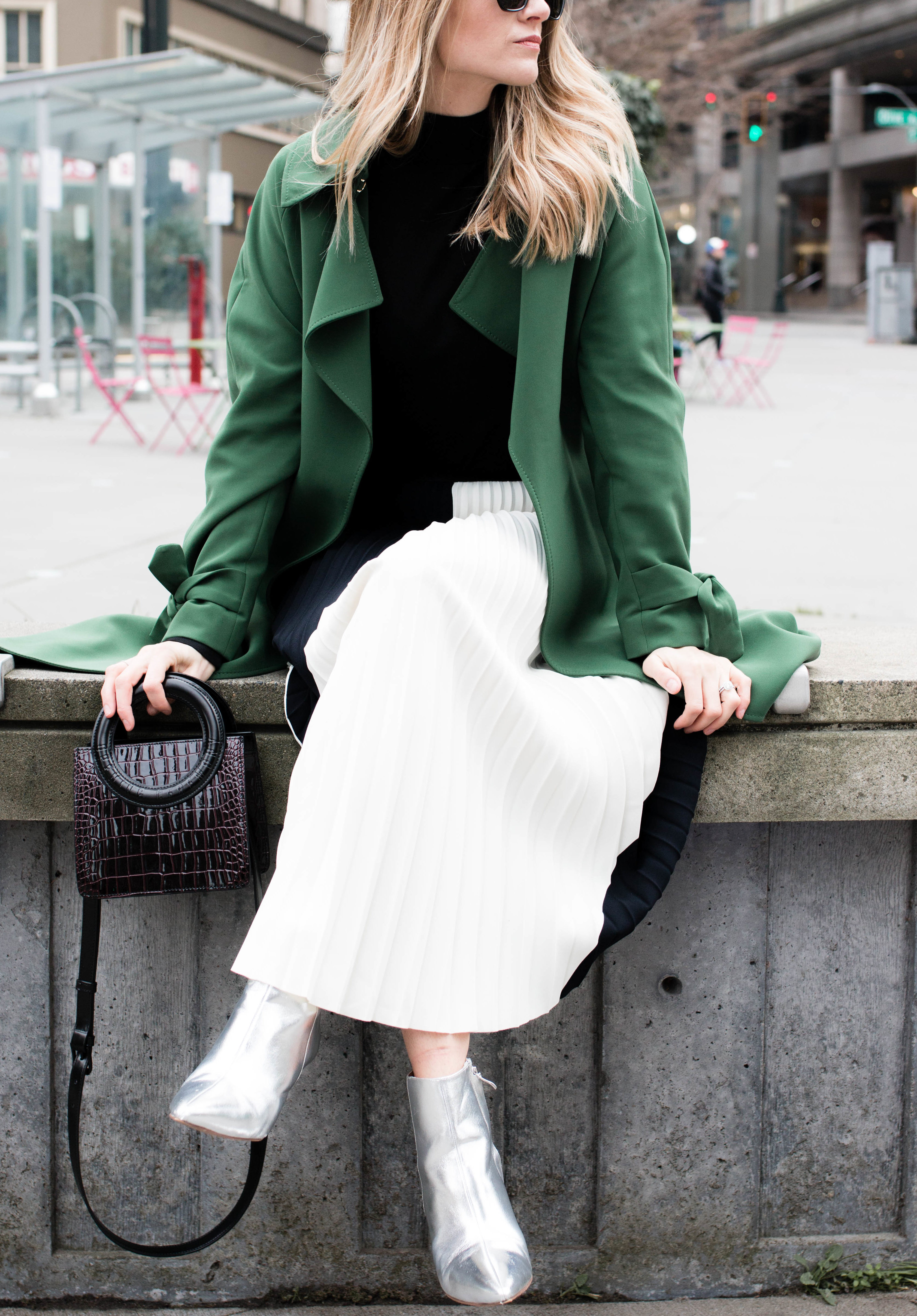 The black and white option I’m wearing unfortunately isn’t available anymore, but the orange is the same high/low cut and pleated style. I dropped some other faves here that will go with the trench options above and are guaranteed fun when twirling.